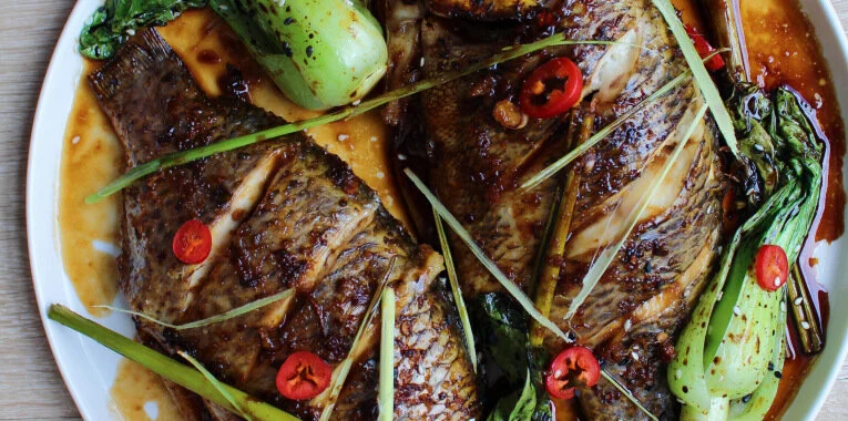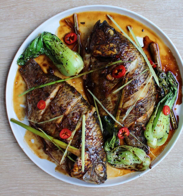 Once fish is cooked, Drizzle with the lemongrass – ginger syrup and enjoy with sticky rice.